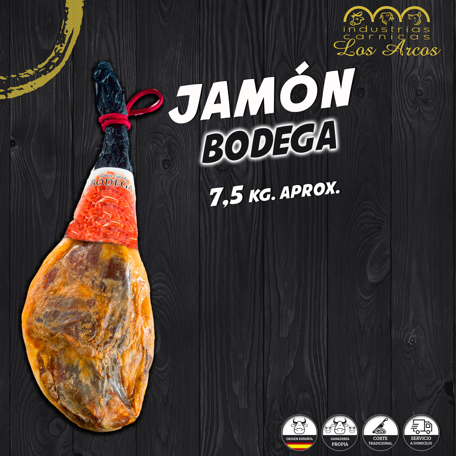 Jamón de bodega pieza entera de 7,5kg aprox. a 79€ . Se añadirá al pedido 1 pieza por unidad seleccionada.